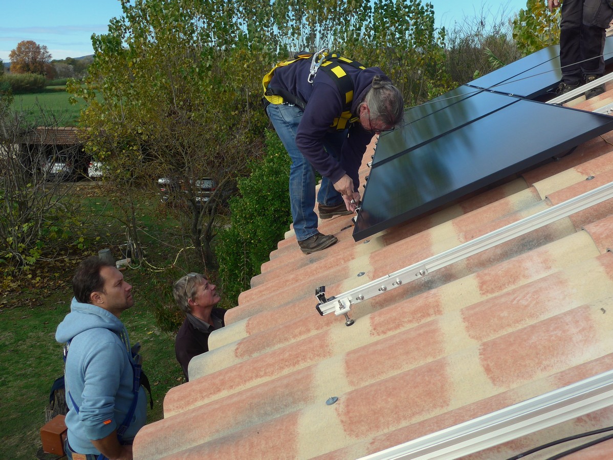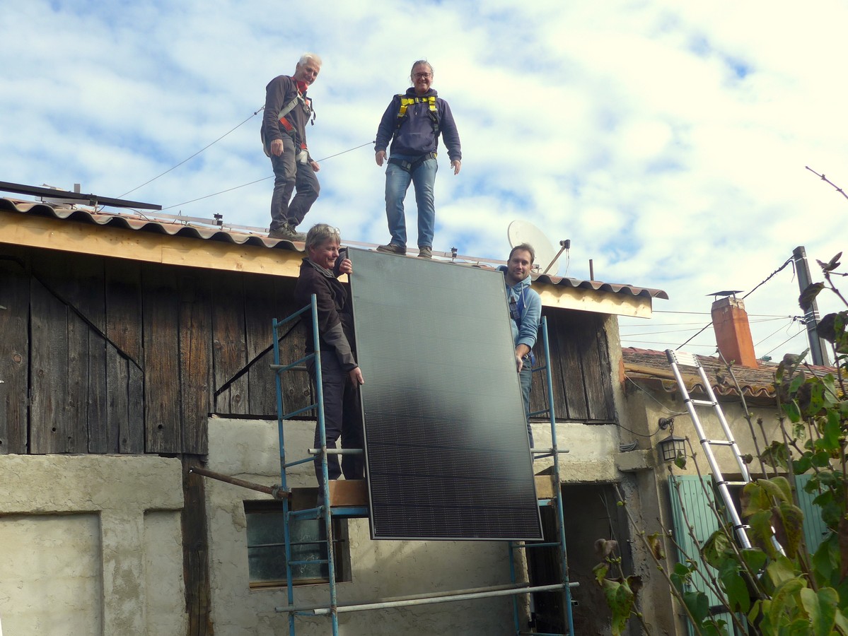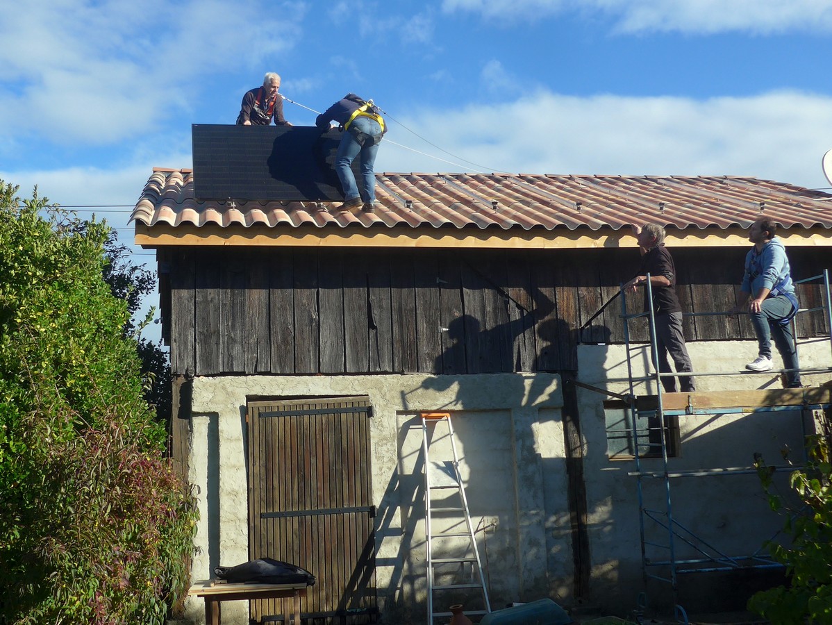 Avec 4 personnes de l’association, les 8 modules ont été mis en place dans la matinée. En début d’après-midi l’onduleur a été mis en marche et la configuration du smartphone et du serveur SMA a été effectuée.