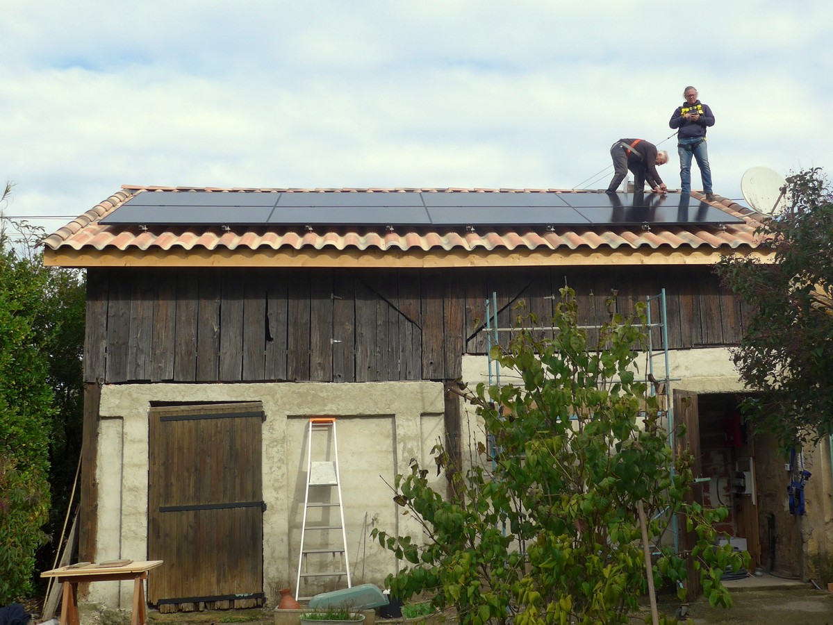 La pose des modules du neuvième chantier à Pertuis (84120) a été réalisée le 8 novembre 2025. Le chantier avait été très bien préparé avec un bon alignement des rails, et la pose de l’onduleur et du coffret DC+AC. Les câbles avaient été passés entre le toit et le coffret, et du coffret au tableau électrique.