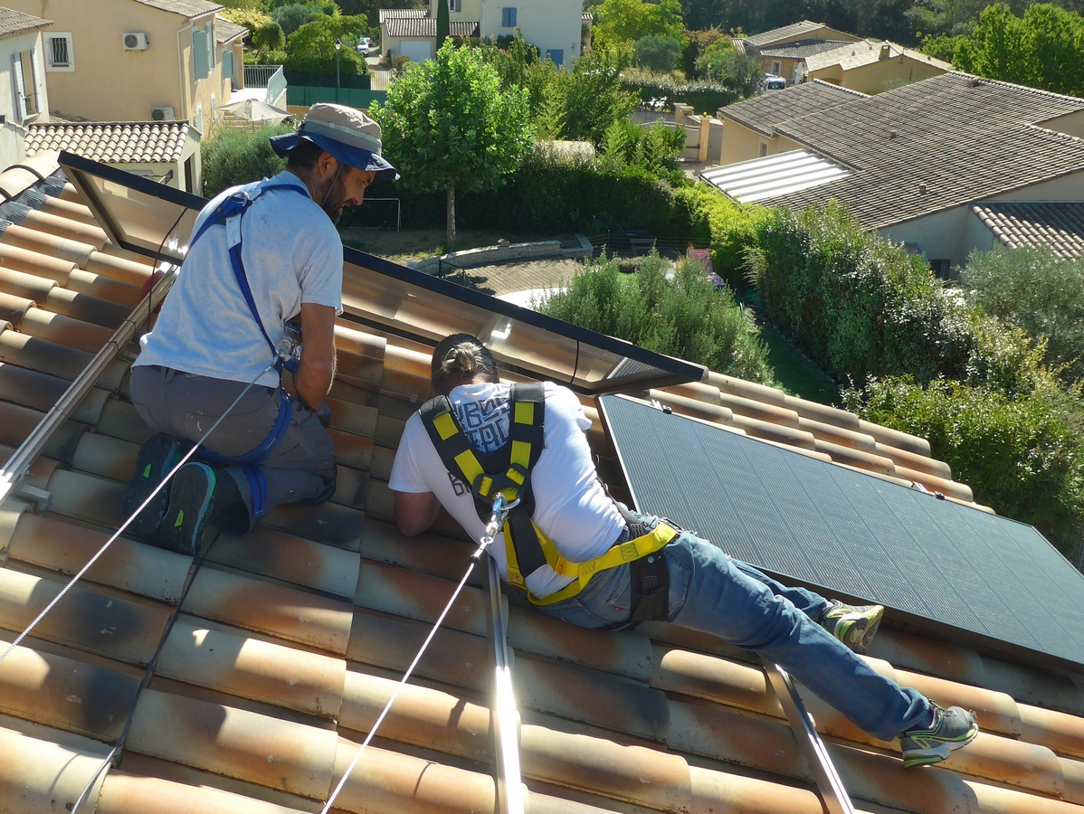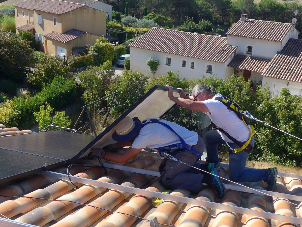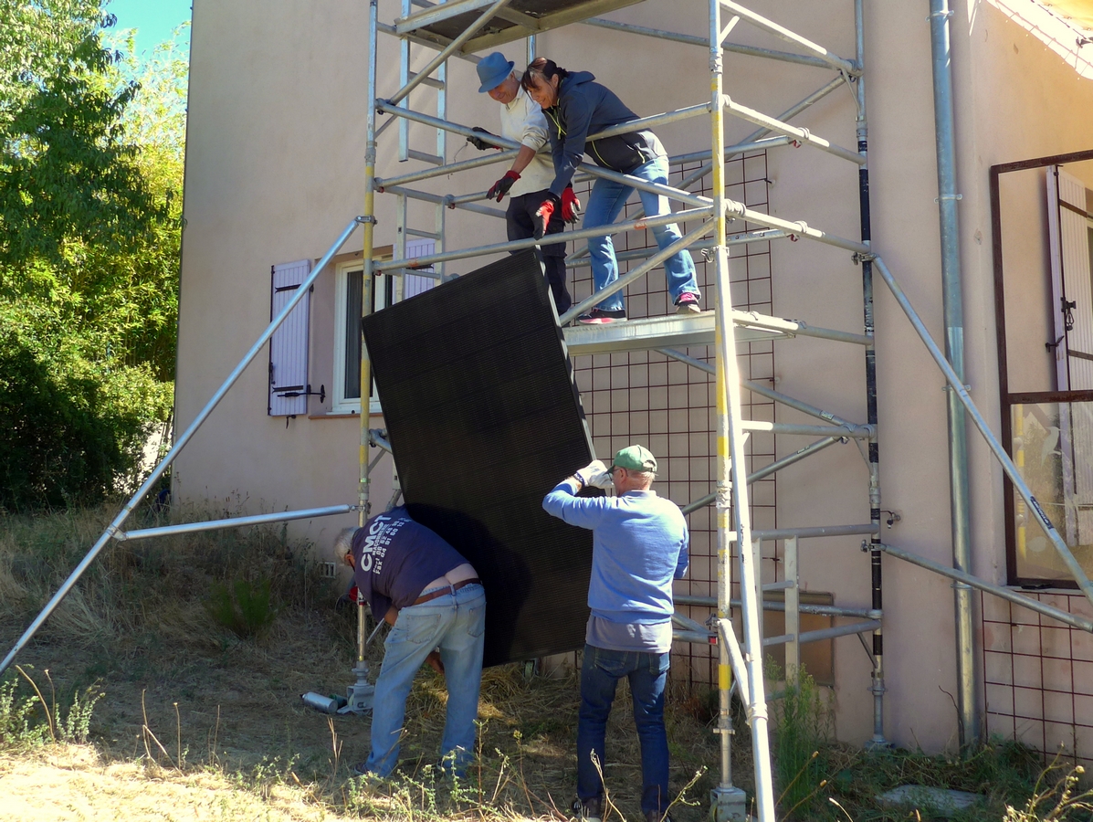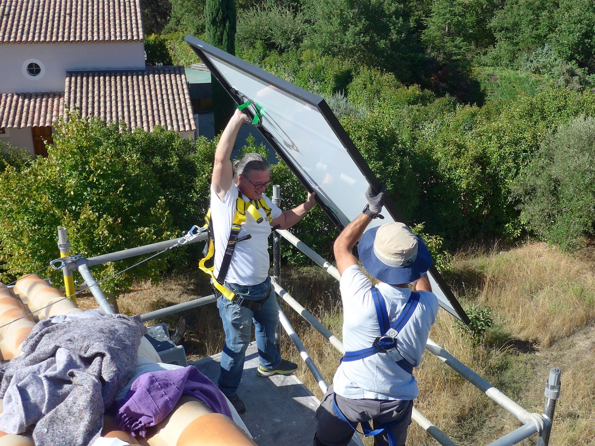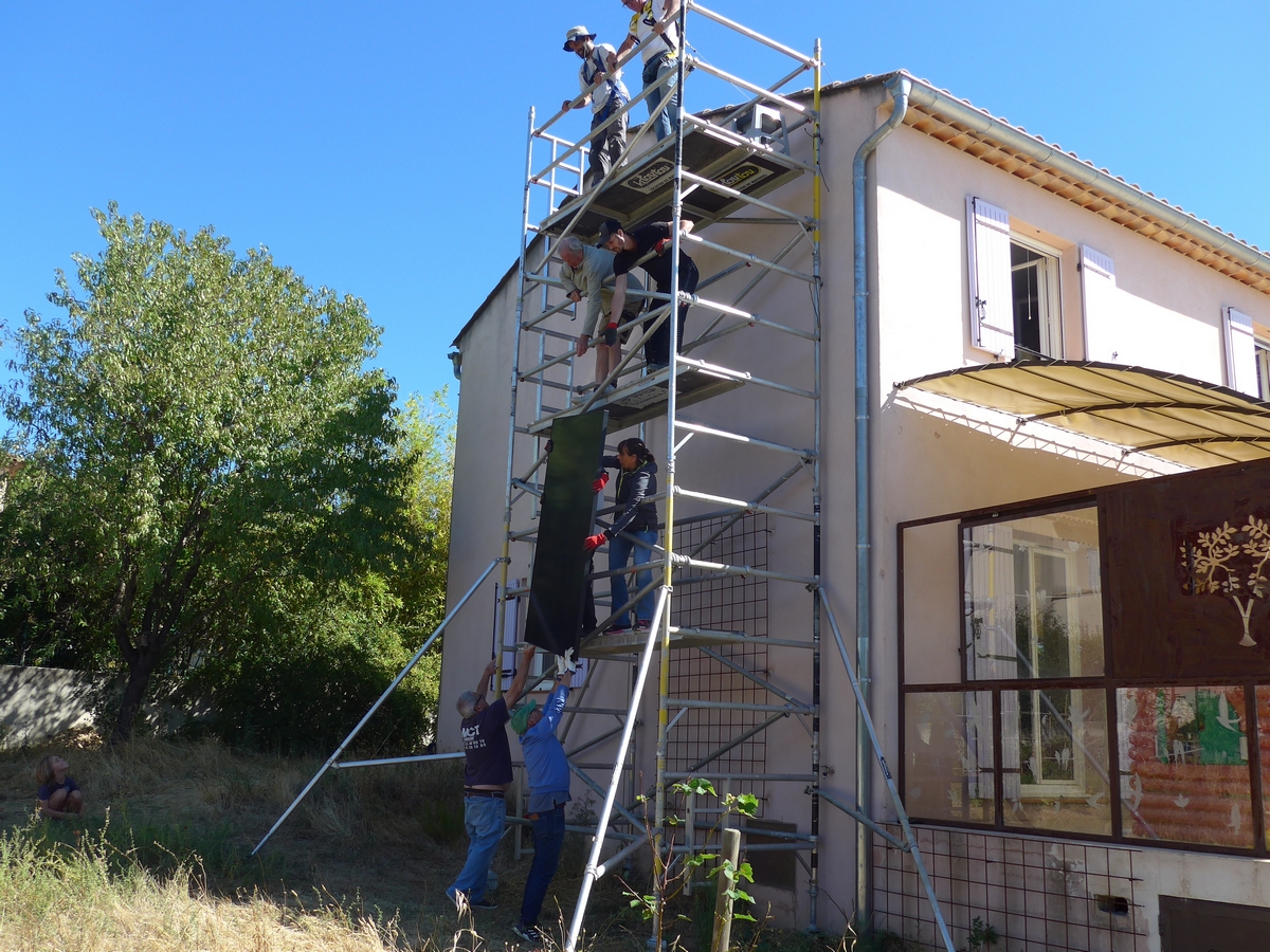 Notre deuxième chantier à Villelaure (84530) a été réalisé le 30 aout 2025. Tout avait été parfaitement préparé et la mise en place des 16 modules n’a pris qu’une matinée. Mais la hauteur du toit (entre 7 et 8 m) a nécessité l’utilisation d’un gros échafaudage et la mobilisation de 8 adhérents.
