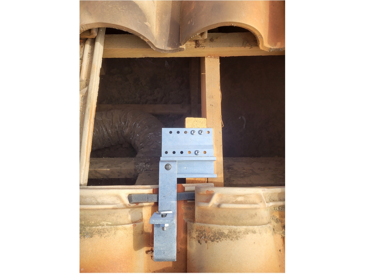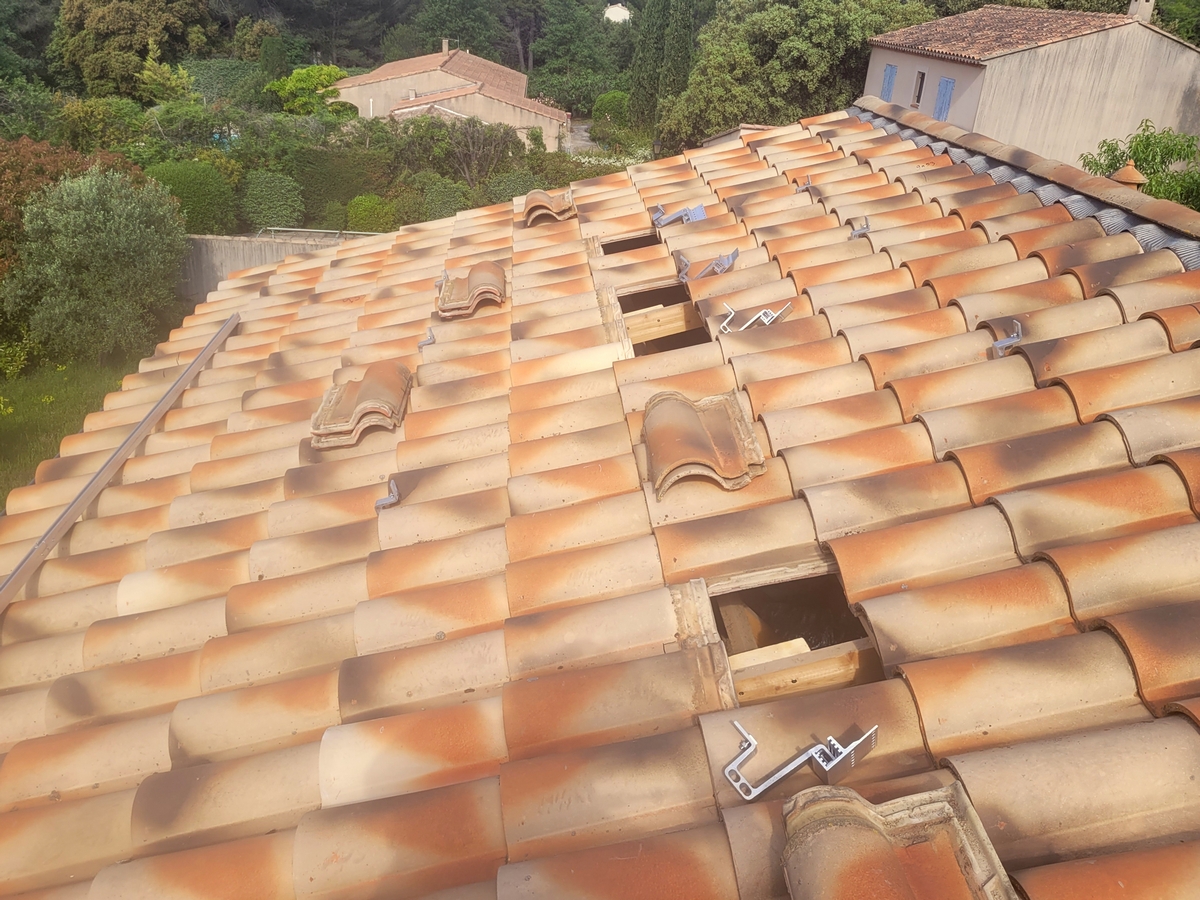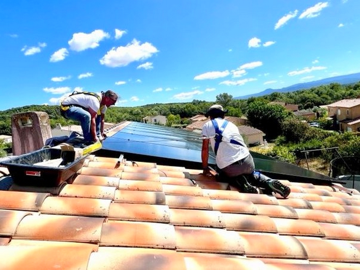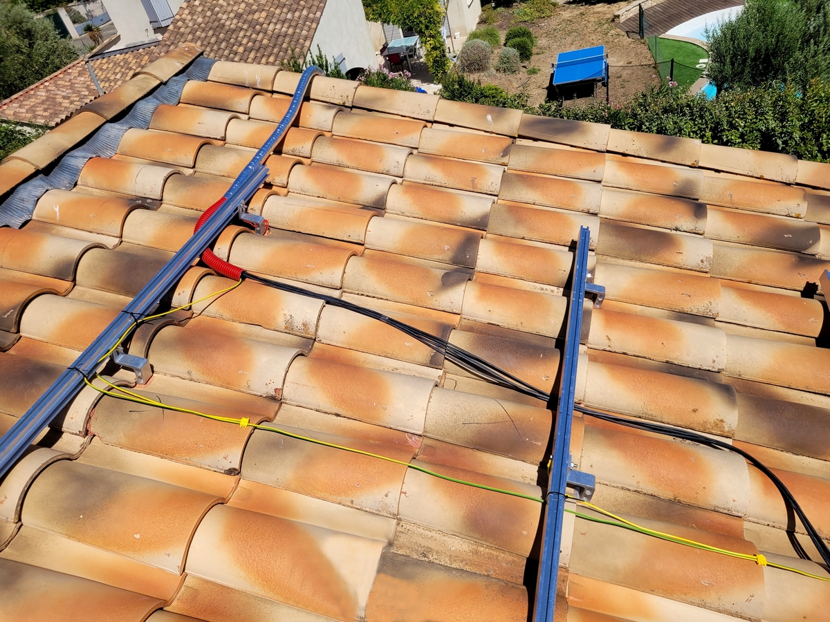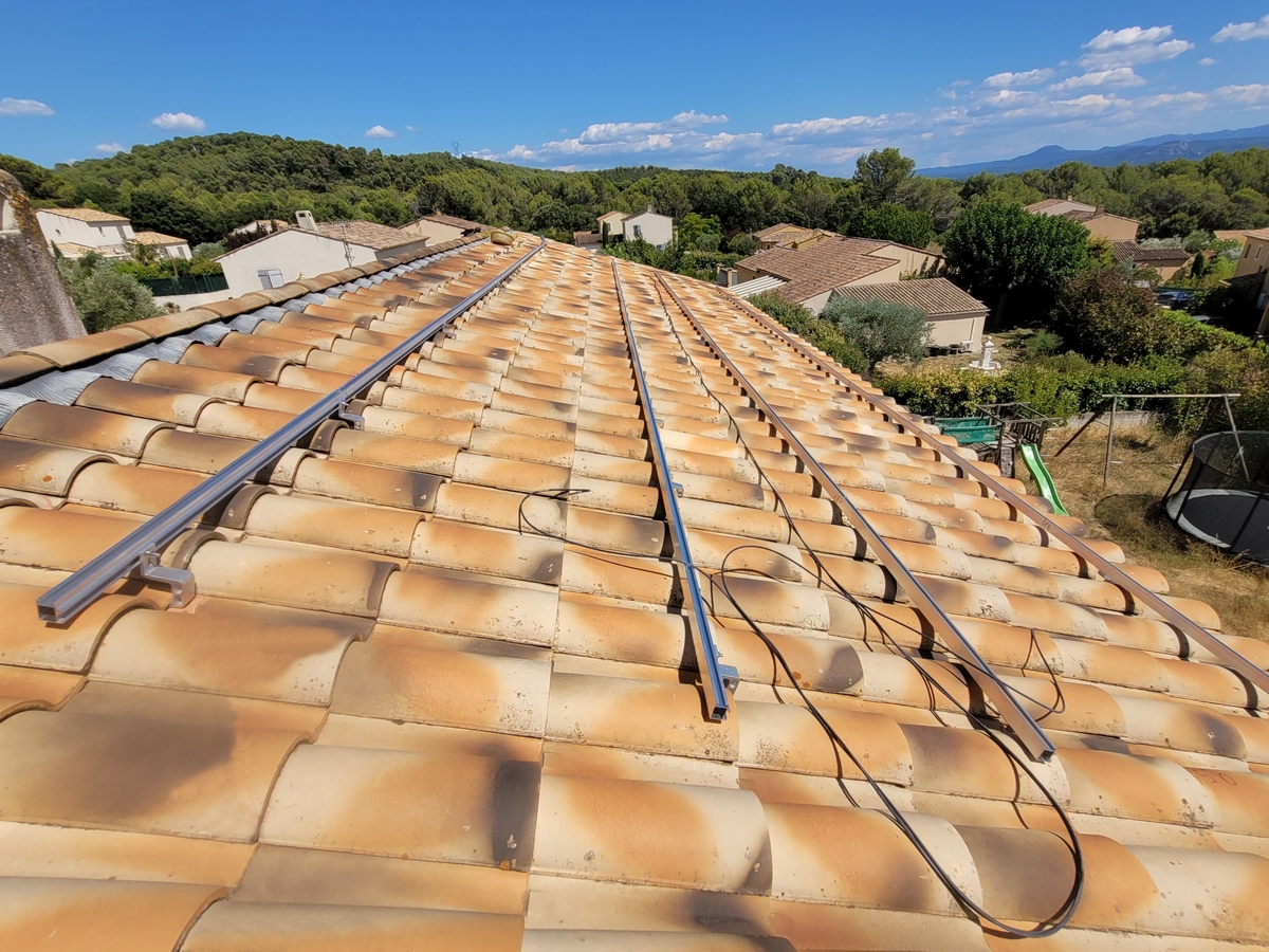Notre deuxième chantier à Villelaure (84530) a été réalisé le 30 aout 2025. Tout avait été parfaitement préparé et la mise en place des 16 modules n’a pris qu’une matinée. Mais la hauteur du toit (entre 7 et 8 m) a nécessité l’utilisation d’un gros échafaudage et la mobilisation de 8 adhérents.