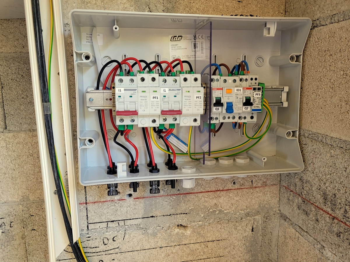 Le coffret avec l’arivée DC à gauche et le départ AC vers l’onduleur à droite